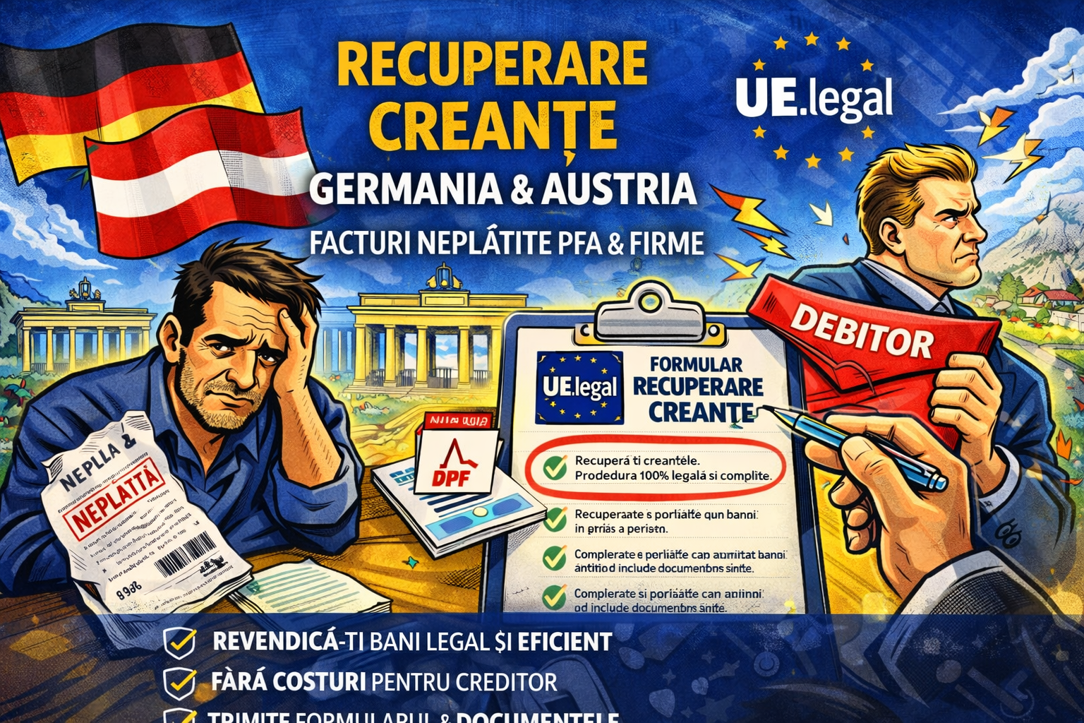 Începând cu 1 ianuarie 2026, UE.legal oferă servicii specializate de recuperare creanțe (Inkasso) pentru românii care lucrează în Germania și Austria ca PFA, Gewerbe sau firmă și se confruntă cu facturi neplătite de către clienți.